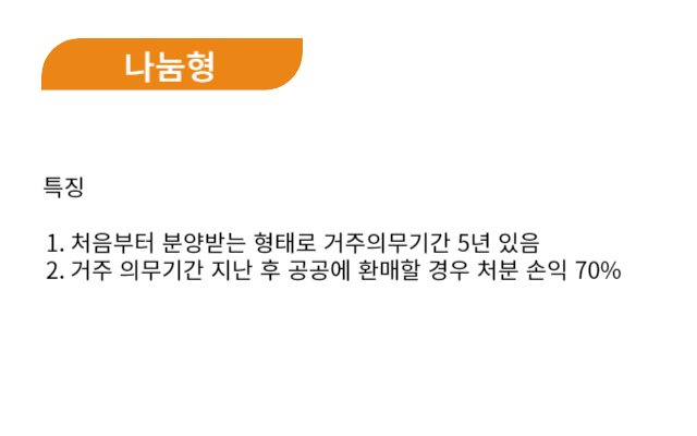 - 거주의무기간이 끝나면 개인한테는 팔 수 없고 공공에 환매 시 시세 차익 70% 보장합니다. (나머지 30%는 공공 귀속)